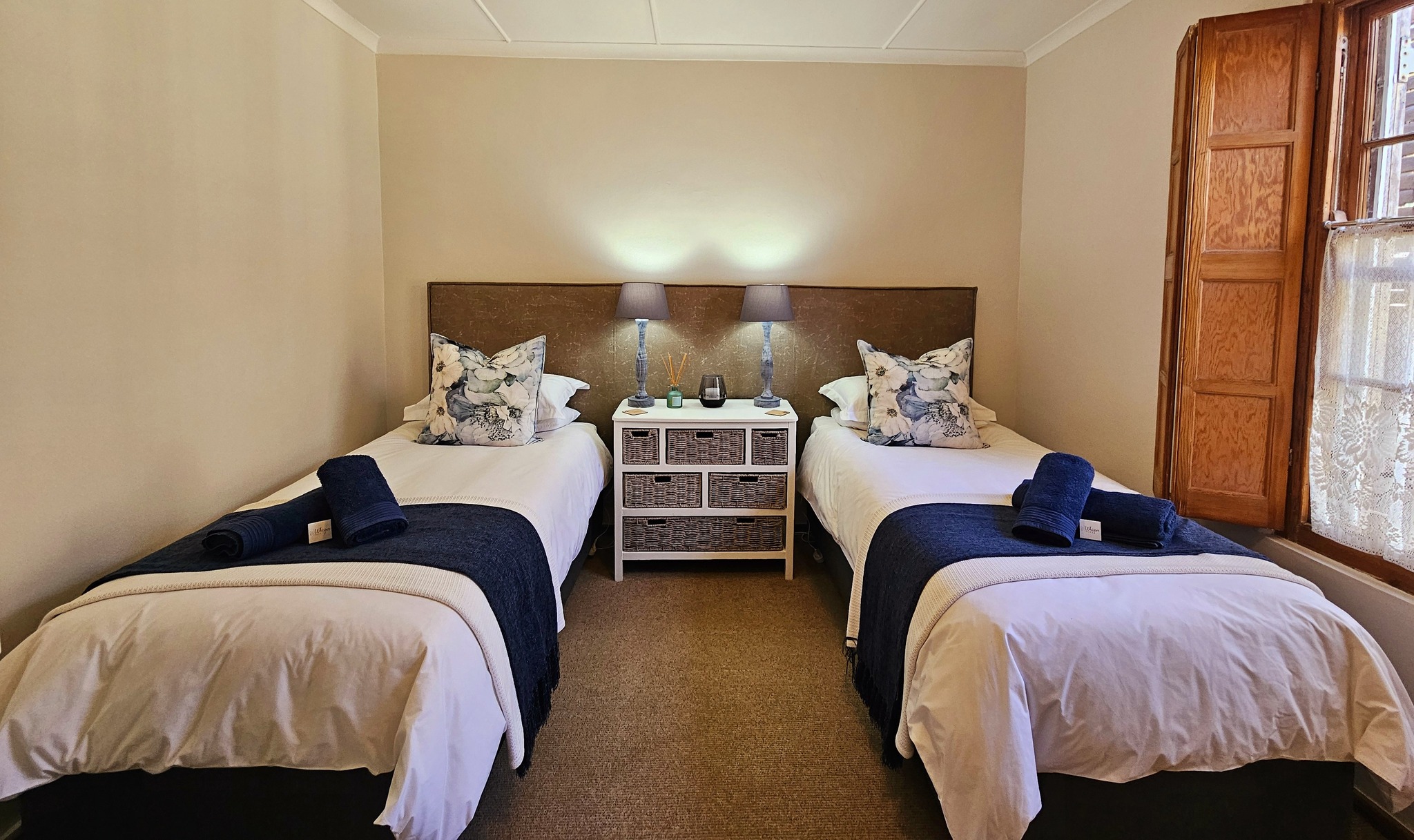 The Twin Room is fitted with a shared separate bathroom adjacent to the room. The bathroom includes a bath and shower. The room features coffee/tea facilities, a ceiling fan, TV with DStv and Wi-Fi