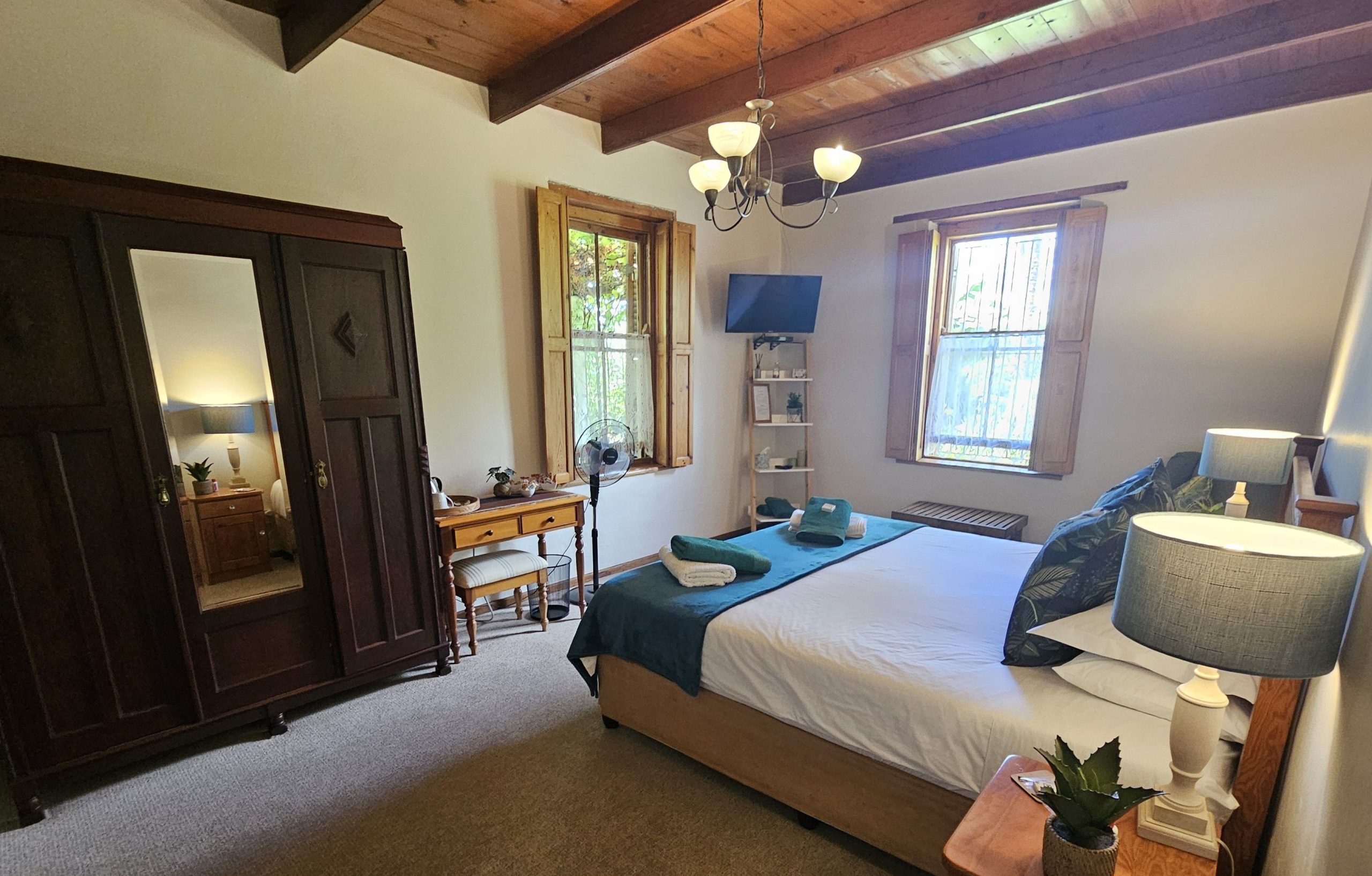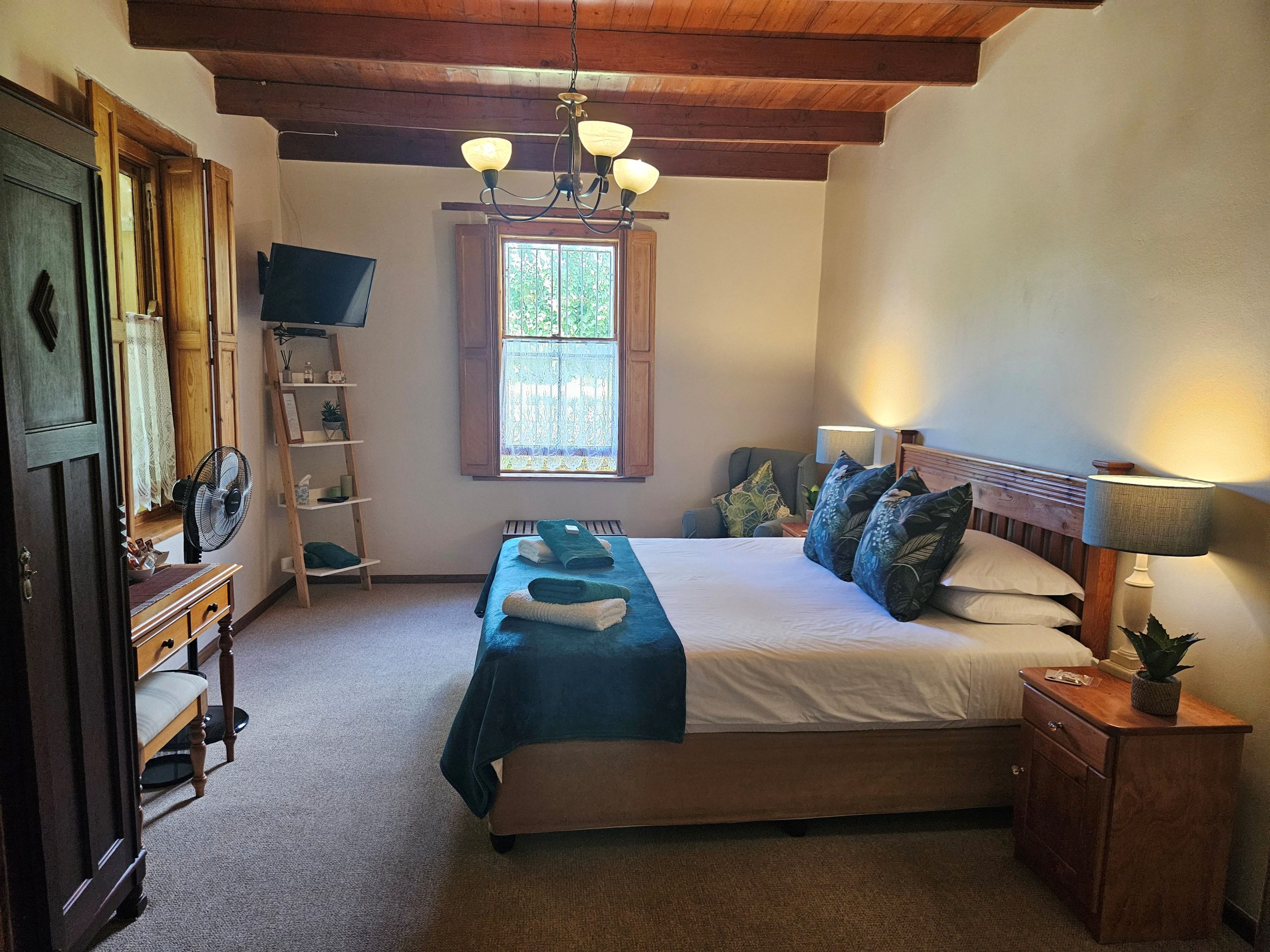 Large Luxury Room with a King-size bed and full en-suite bathroom with double basins, extra-large bath and shower with beautiful stained glass windows. It features bathroom amenities, coffee/tea facilities, DStv, TV and Wi-Fi.