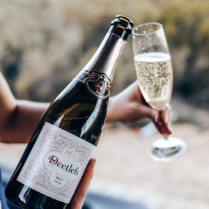 Bottle of Deetlefs 2019 Méthode Cap Classique sparkling wine on arrival